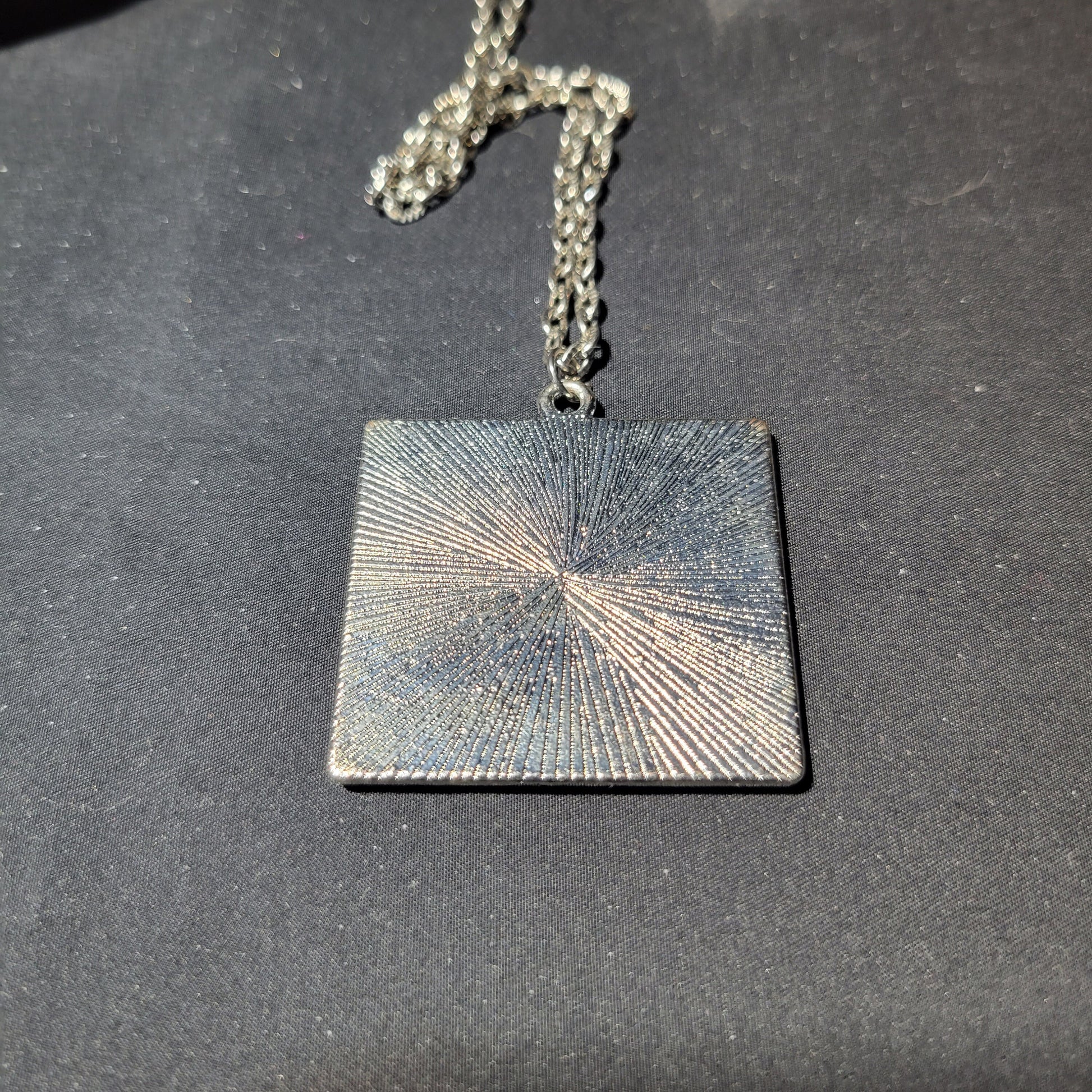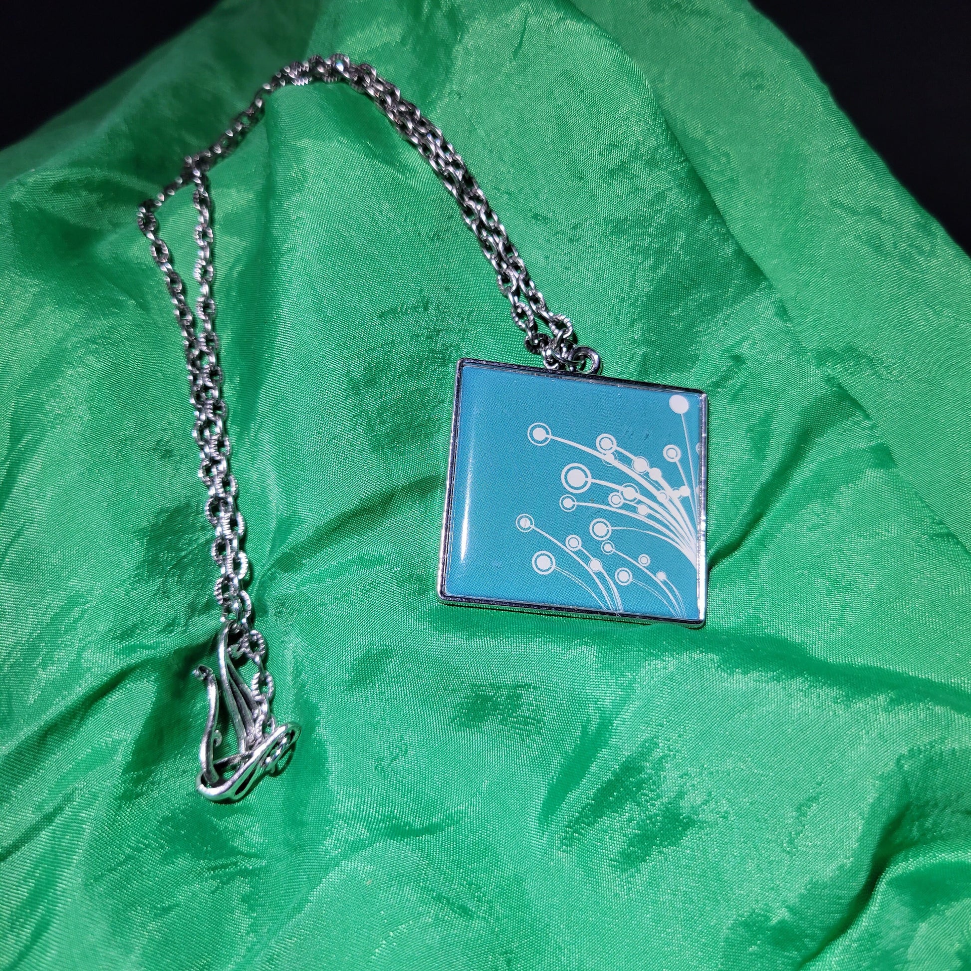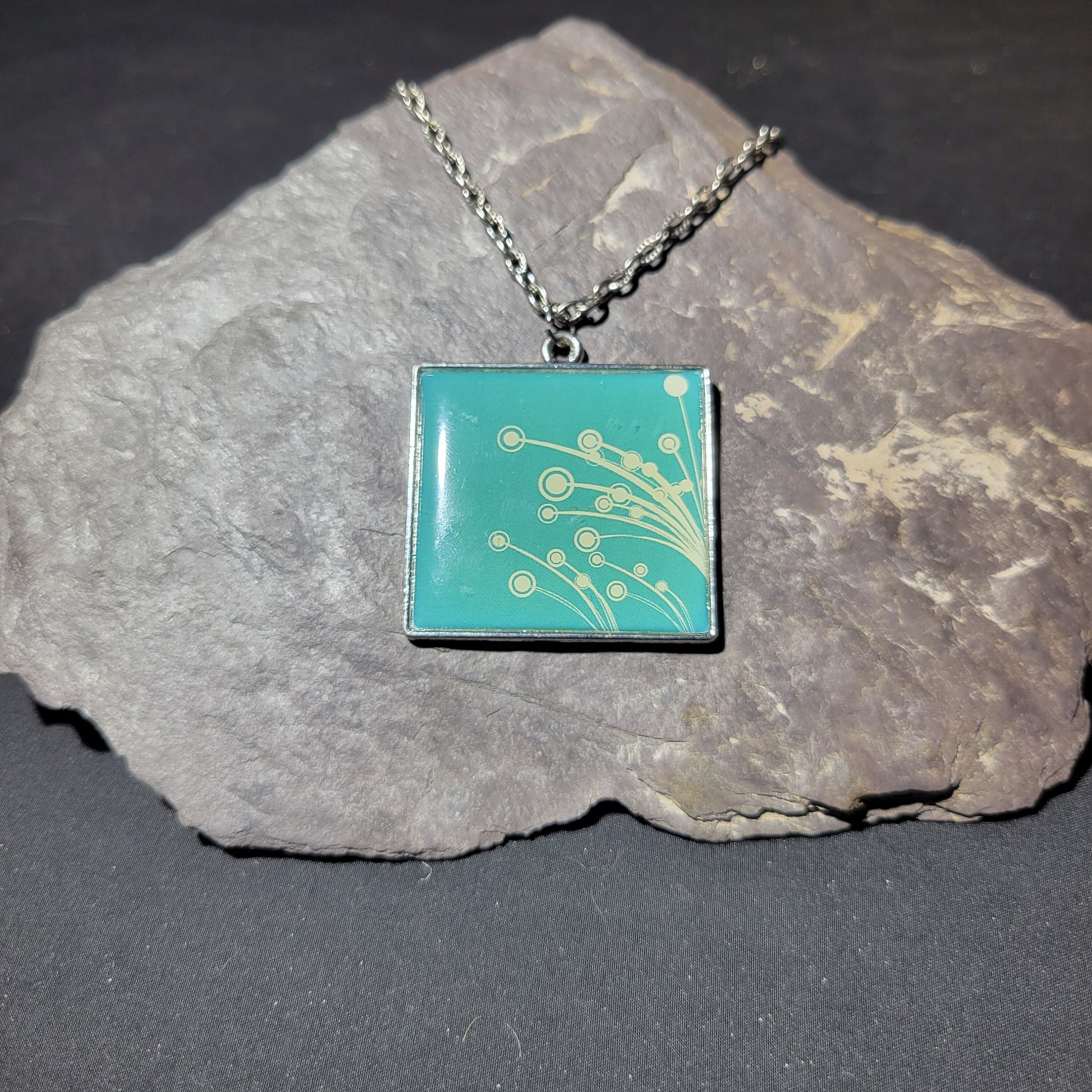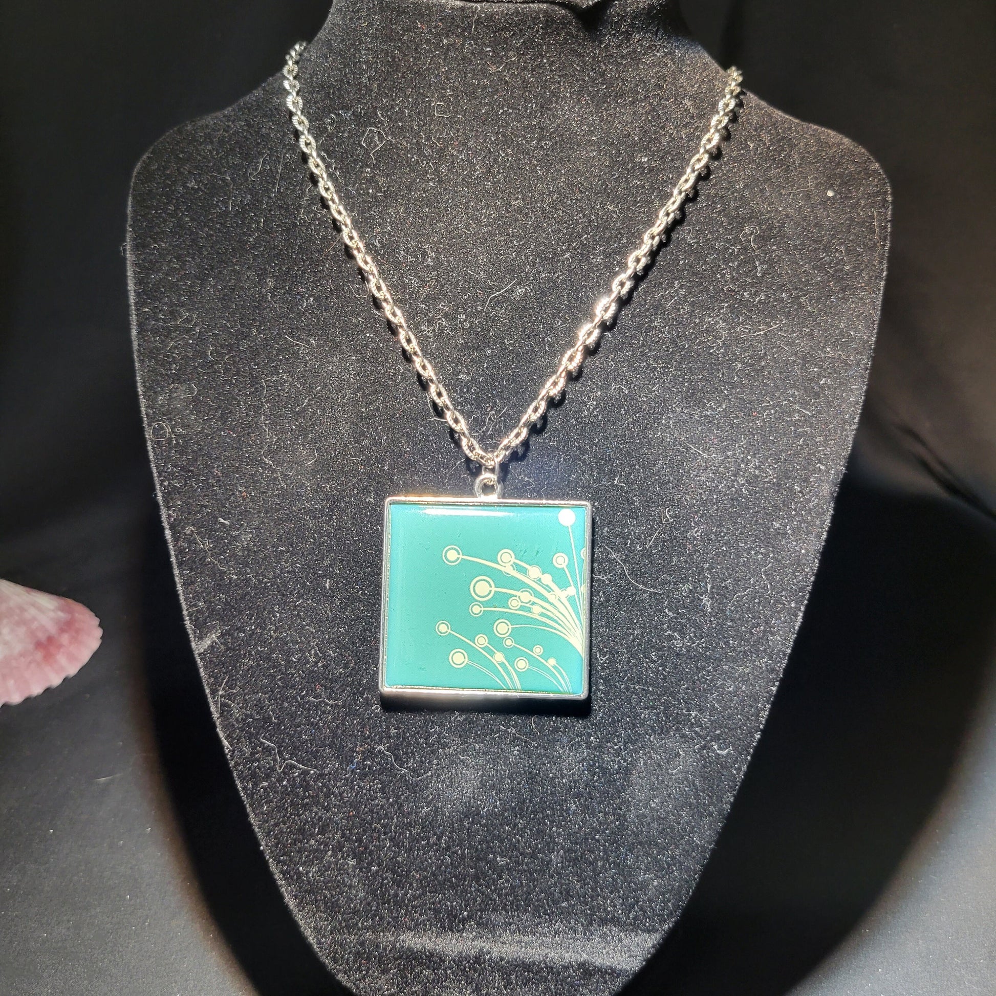 This teal square pendant is 1.5" and has a spray of flowers, spores, or dandelion heads on it. You decide! It hangs from a 20-inch round link silver chain with a hook and eye closure.Only 1 available