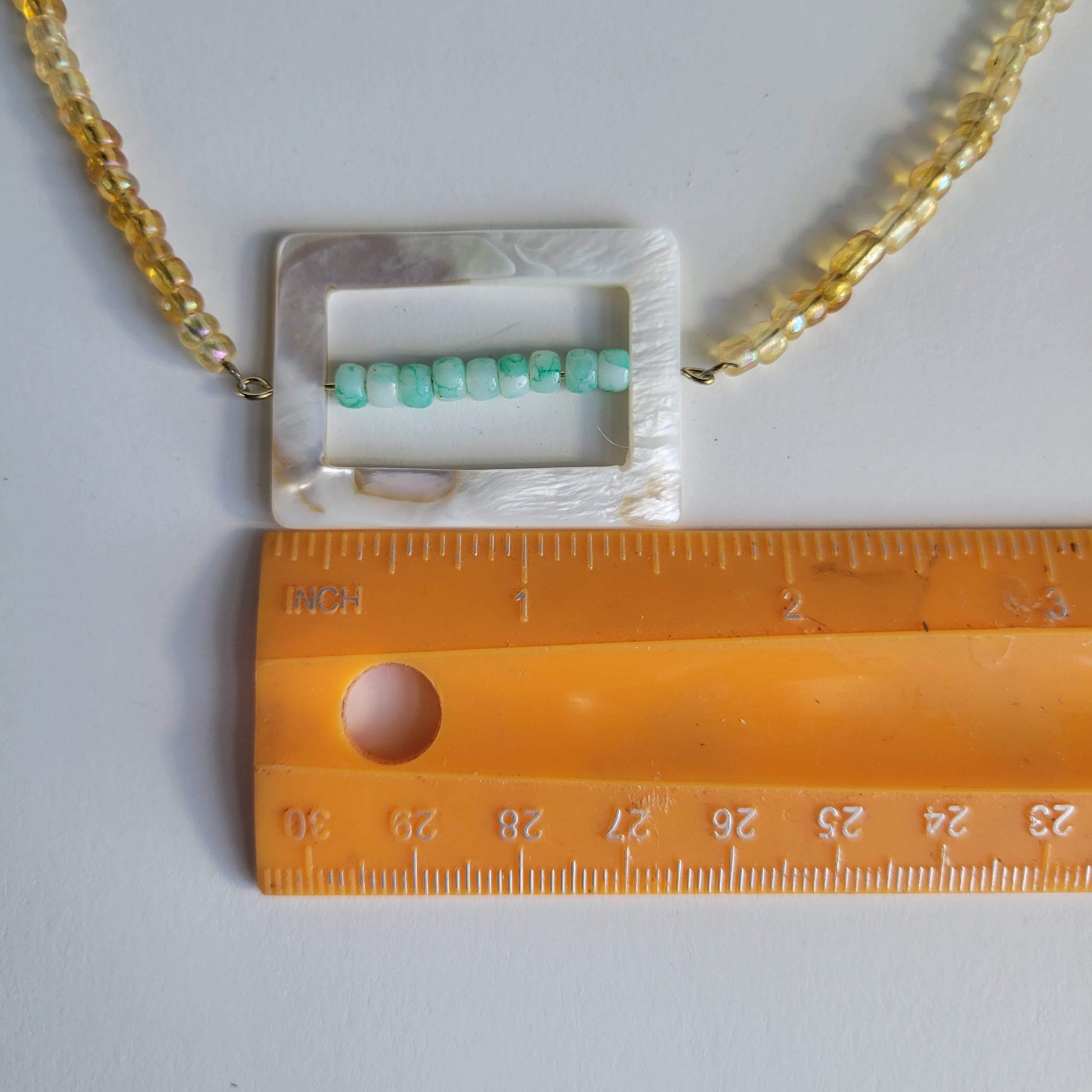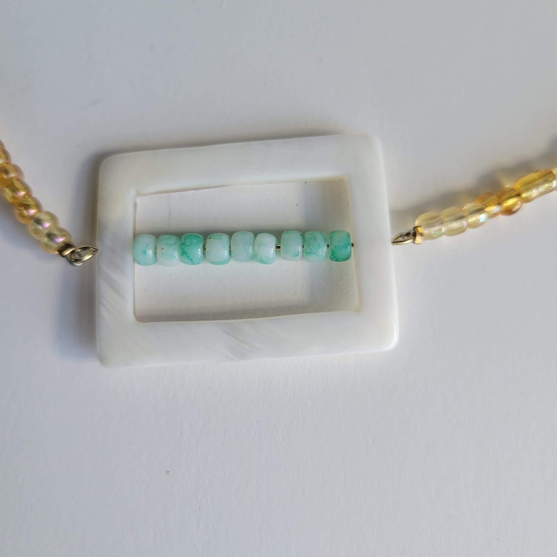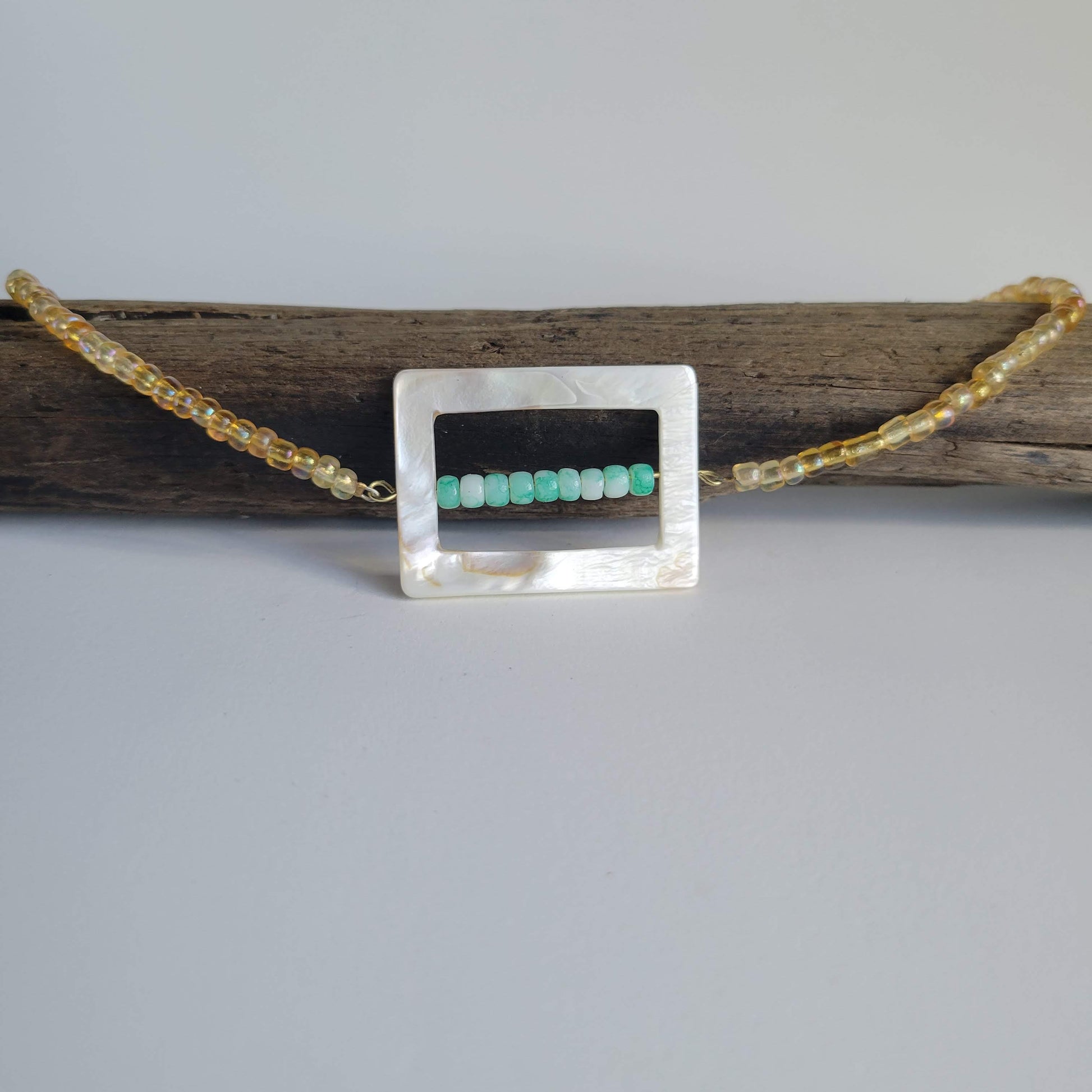 A subtle yet stunning statement necklace, this piece features gold beads paired with seafoam beads set inside a square. Perfect for everyday wear, this necklace will lend the perfect pop of color to any ensemble!
