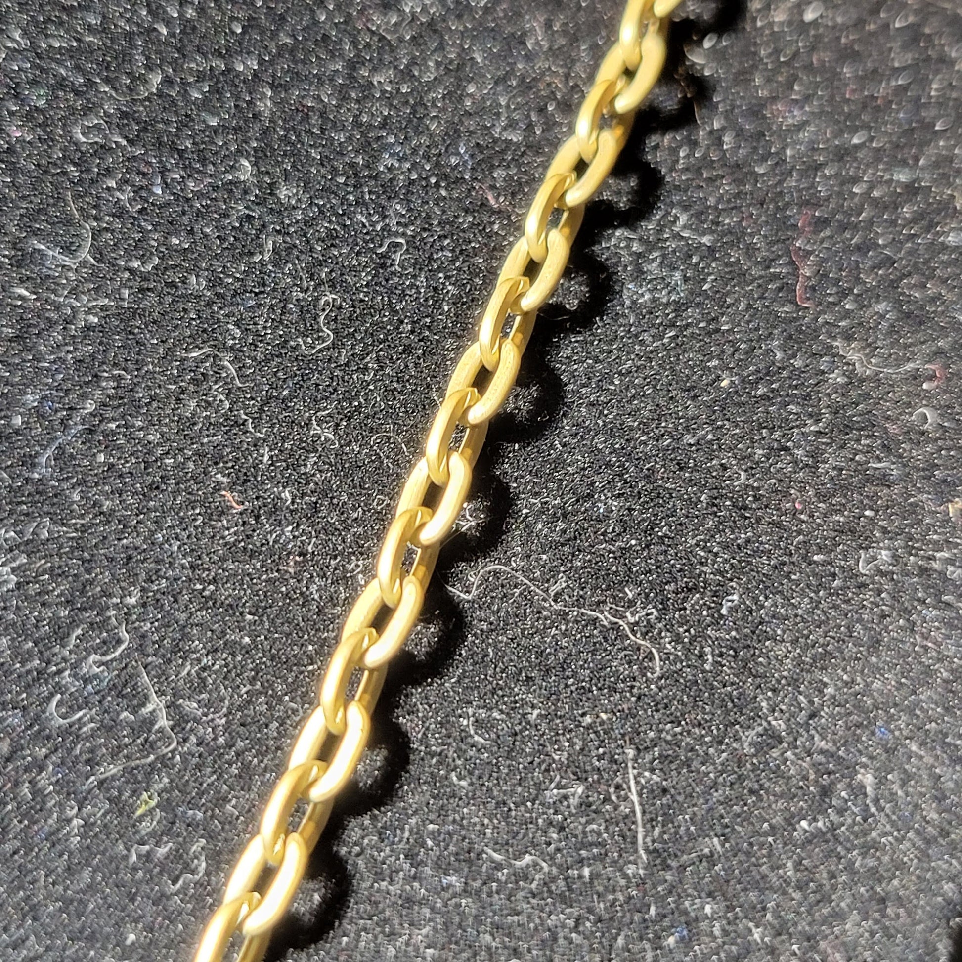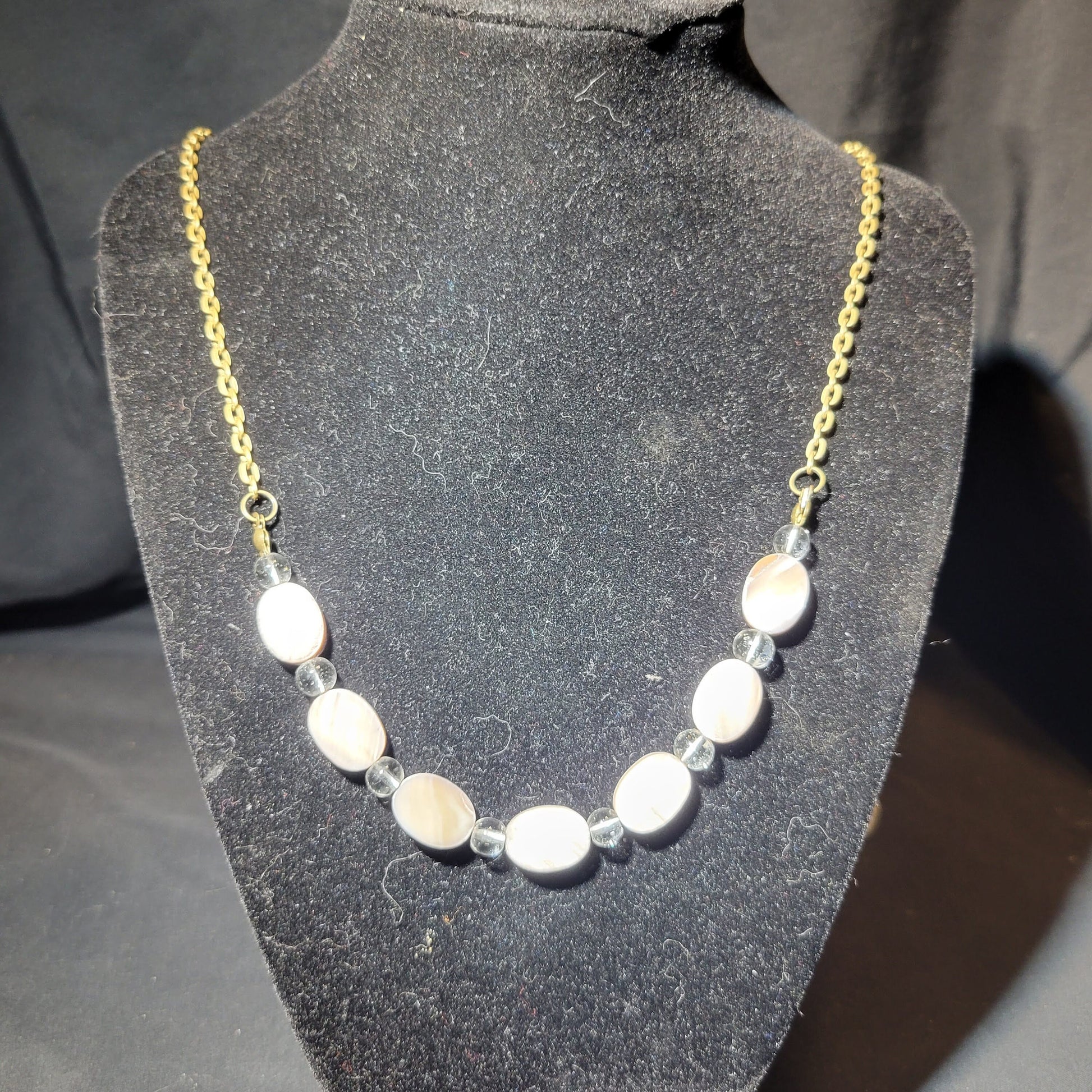 This 30-inch beaded necklace consists of alternating oval taupe and clear round beads strung between an antique gold chain with a toggle clasp.Materials: oval taupe beads, clear round beads, stringing wire, antique gold chain, toggle clasp, jump rings