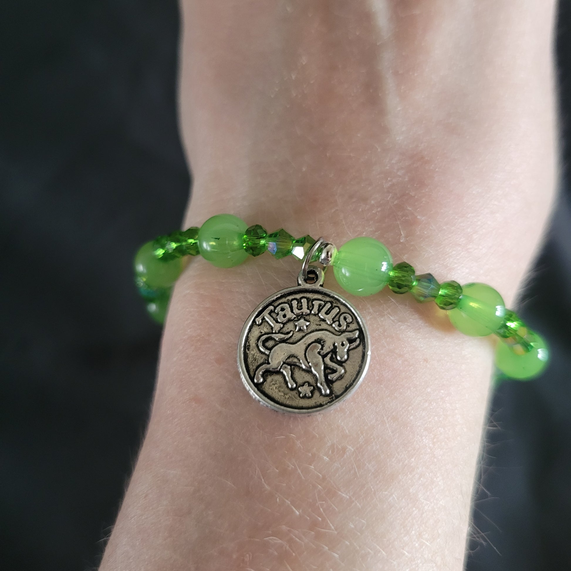 Elevate your style with our Taurus beaded bracelet! Adorned with green round and bicone beads, this bracelet features a Taurus charm on elastic for a comfortable and secure fit. Let this bracelet inspire you with Taurus' passion and drive.