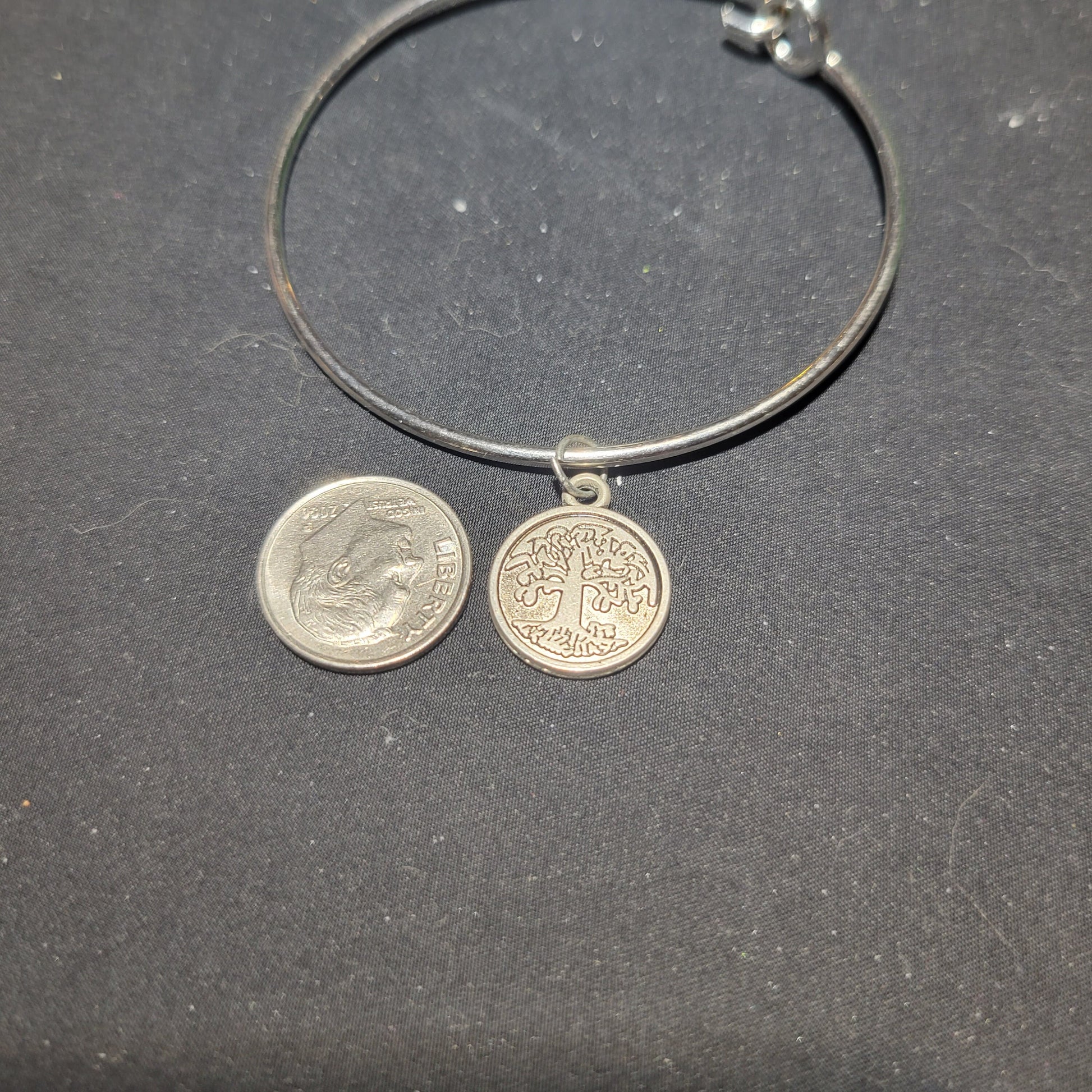 The Tree of Life represents balance and harmony, the link between heaven and earth, mind and body, and the cycle of life. Bring that representation into your life with this Tree of Life charm bracelet. The tree is etched on the circle charm the size of a dime and is almost identical on both sides. The charm hangs from a rigid bracelet or curb chain that fits most wrist sizes.