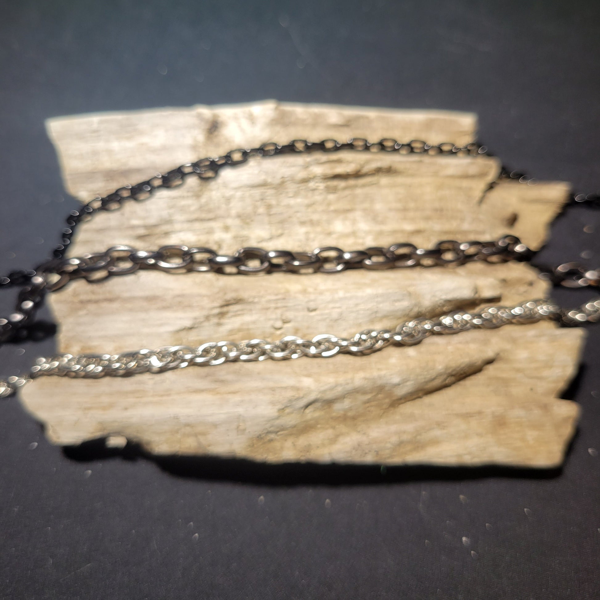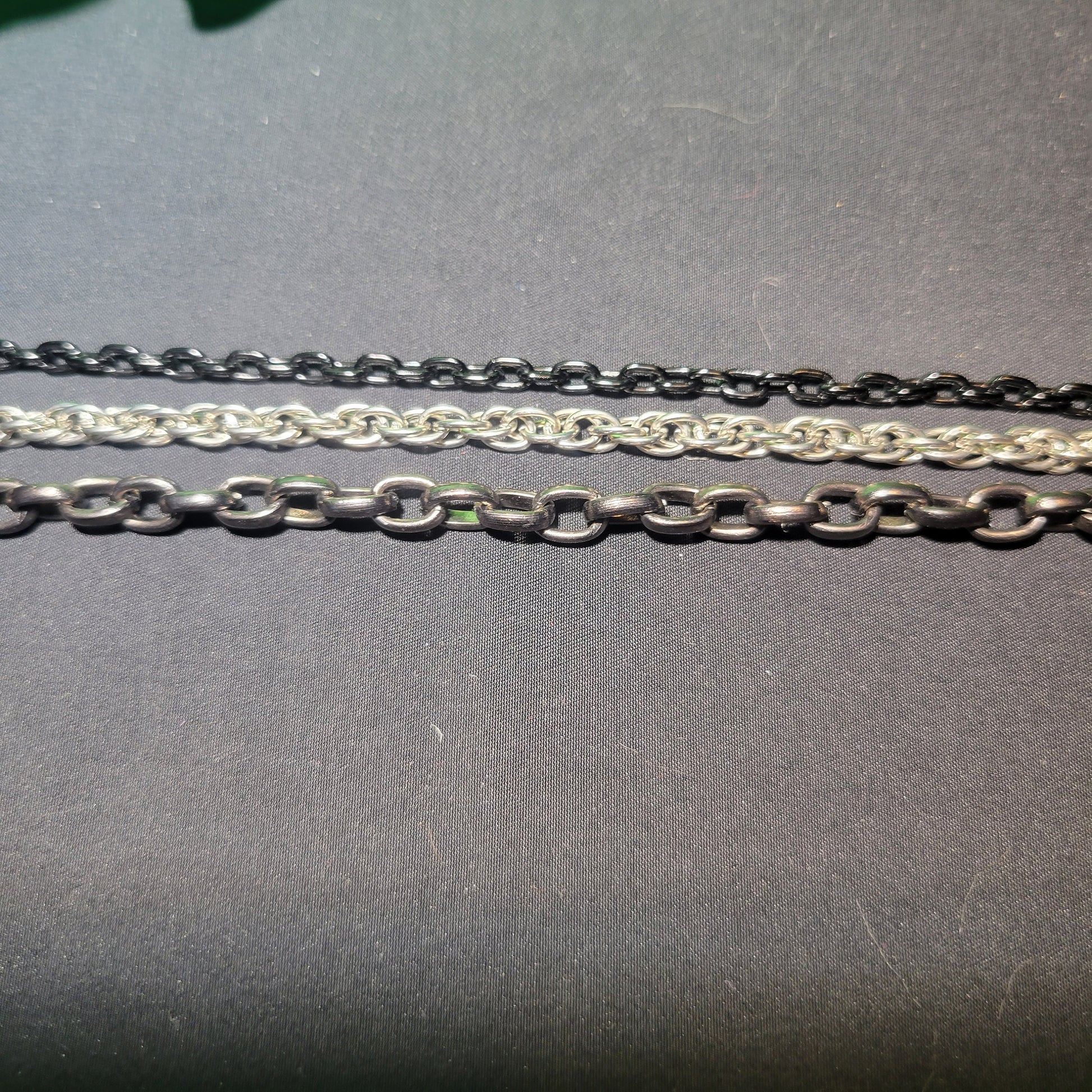 The three strands are black cable, silver rope, and gunmetal cable chains closed with a gunmetal toggle clasp.