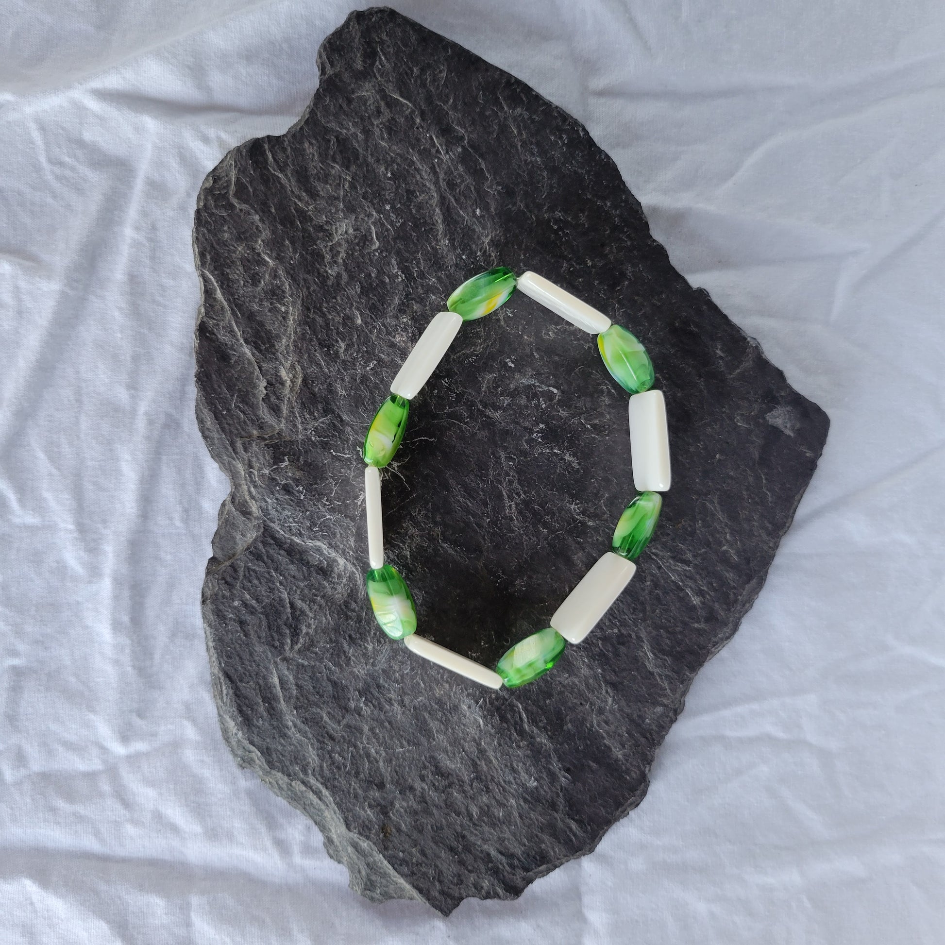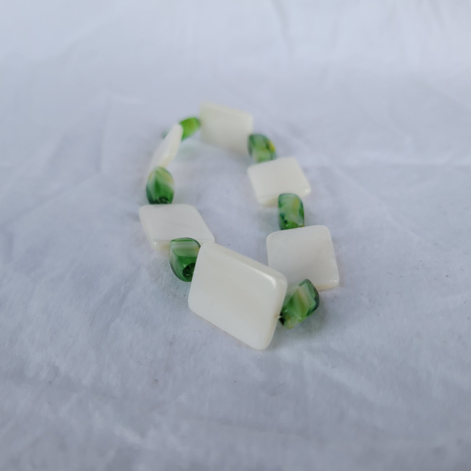 Wear the beach on your wrist with this vibrant White Shell and Green Beaded Bracelet. Featuring white shell squares paired with green glass beads on an elastic cord, you’ll find yourself styling with the essence of summer that brings a special flair to any look.