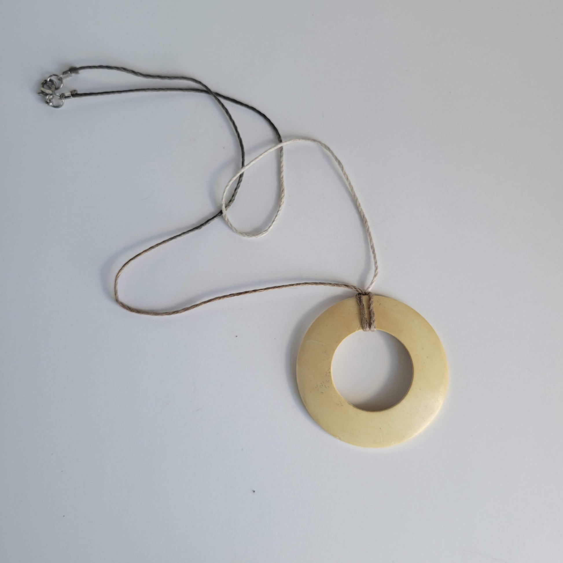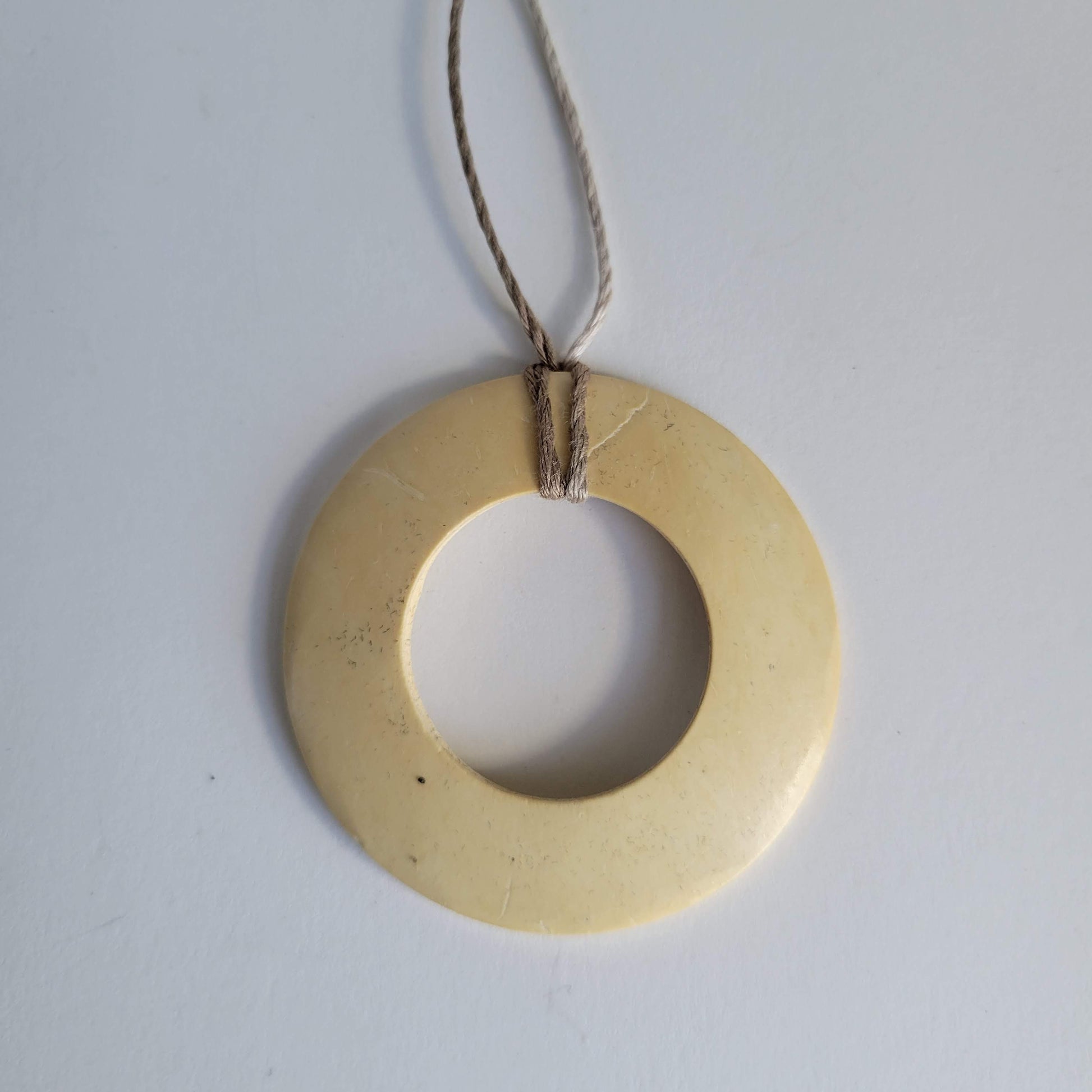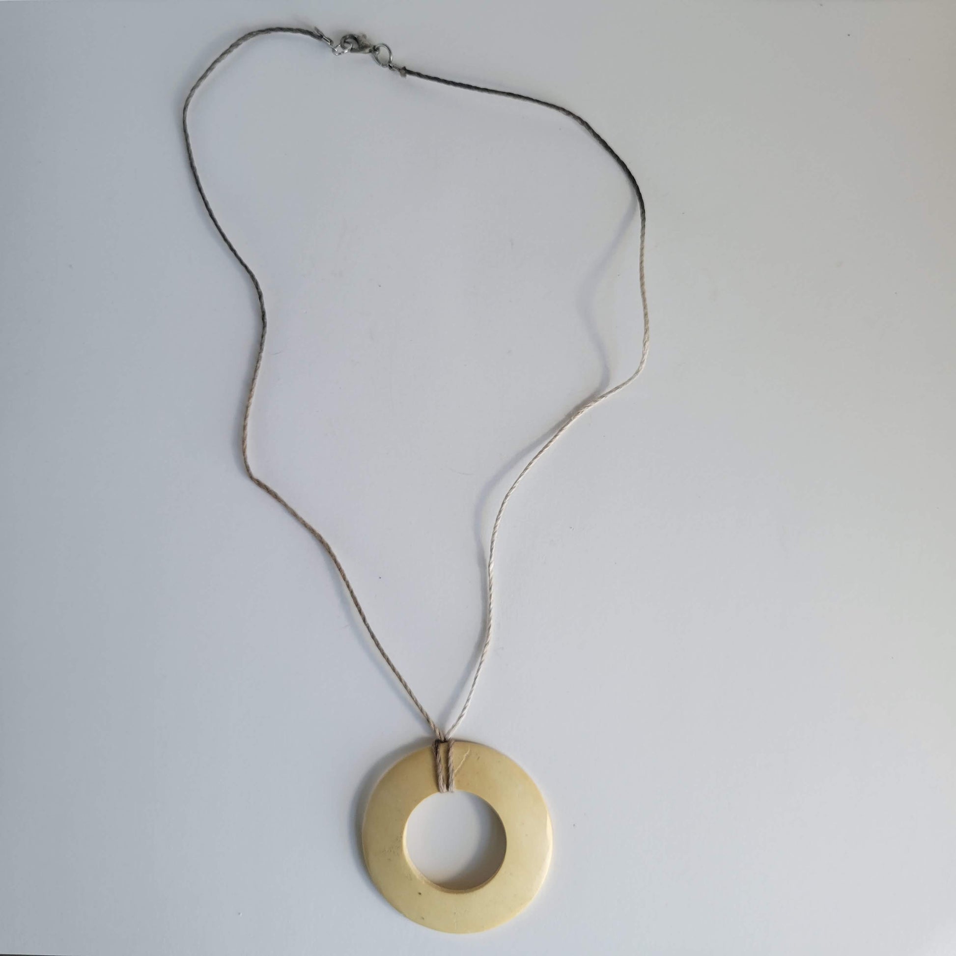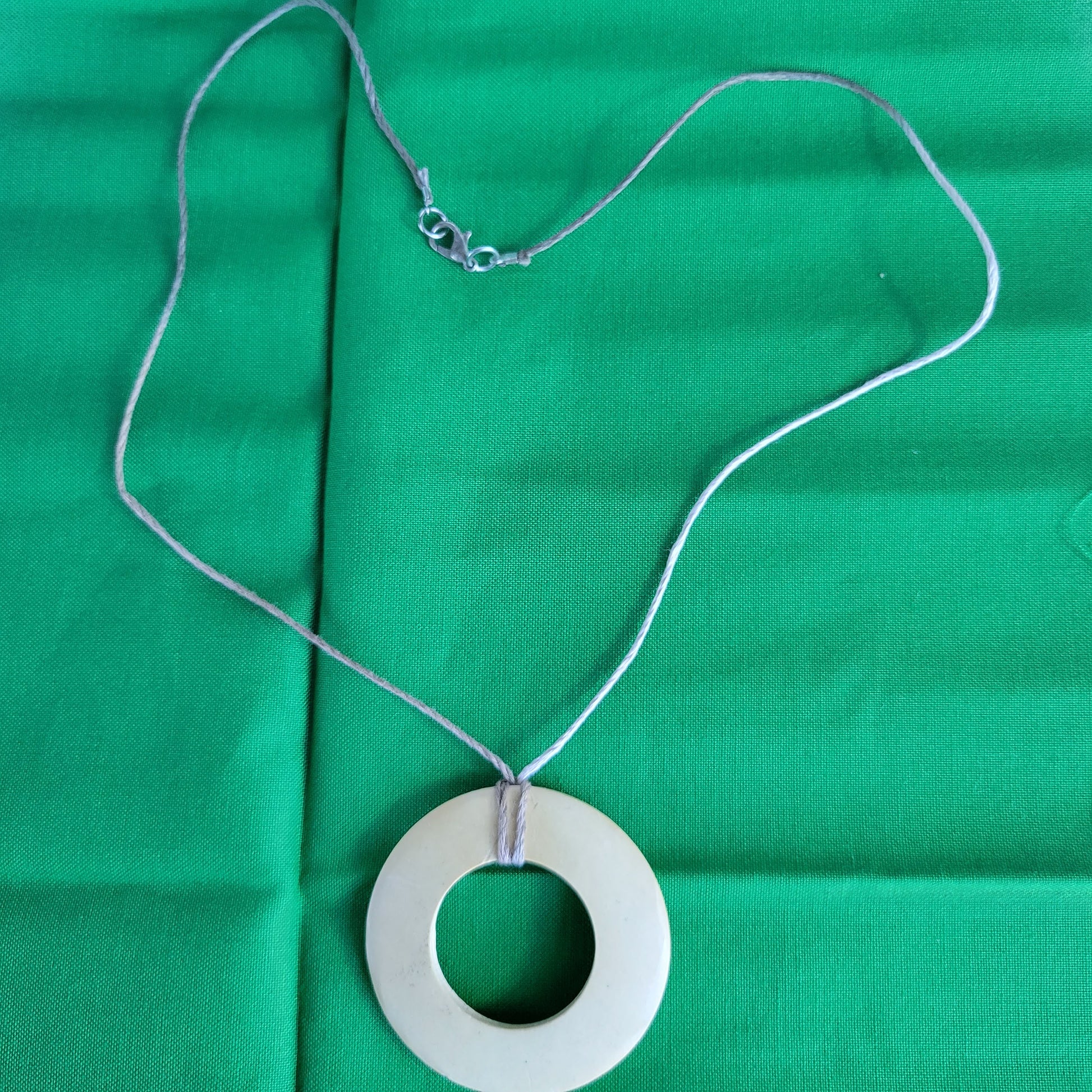 A 2" wood circle pendant hangs on a 21" gradient olive twine with a lobster clasp.