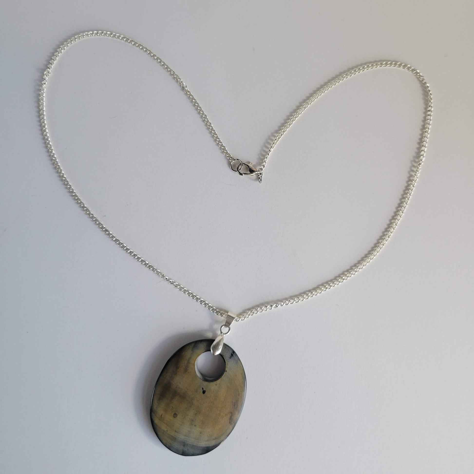 2" wood grain pendant on 22" silver chain with lobster clasp