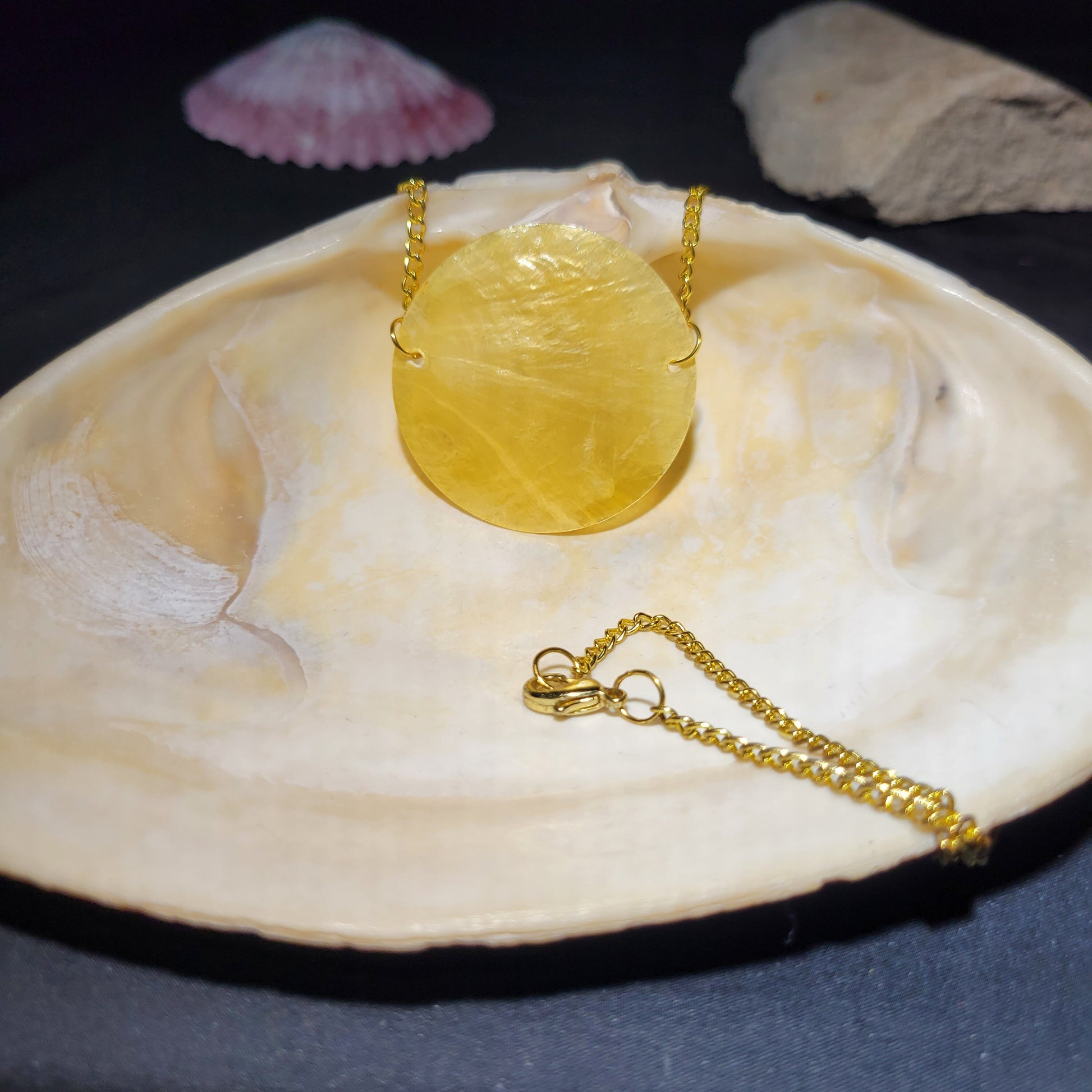 The shell disc is a thin circular cut shell dyed yellow and is 1.5 inches in diameter. The disc connects gold colored curb chain so the necklace totals 21 inches and is closed with a lobster claw clasp.